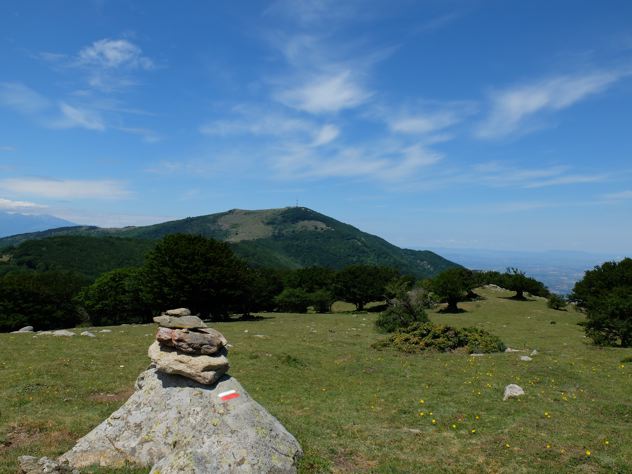 Lundi 16 juin, 7h30 : Traditionnelle photo devant la plaque, en l’honneur du GR 10, qui est posée sur un mur de la Maire de Banyuls. Des jeunes passent. Ils prennent la photo souvenir. Les jours qui suivent, faute de photographe, l’intello en sera réduit aux selfies. Le GPS est branché et, c’est parti. Il y a un vent à décorner les bœufs. Malgré cela, la montée est assez rapide. Derrière, la Méditerranée est un peu sombre. Le soleil, souvent voilé. Dommage.