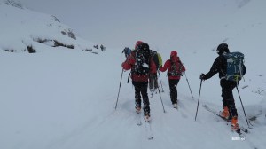 Une neige humide, collante qui ne tarde pas à botter sous les skis. Olivier a beau racler les peaux, une fois, deux fois, trois fois, rien n’y fait. Chaque pas devient galère. Il n’est pas le seul. De dépit, Olivier décide de passer le flambeau de la collective à Ghislaine et d’arrêter ! Tristesse générale…