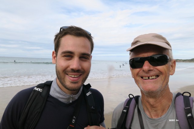 Photo souvenir face à la mer et aux surfeurs. Un look un peu décalé avec nos sacs à dos et bâtons parmi les badauds du dimanche qui déambulent et mangent goulûment leurs glaces artisanales.