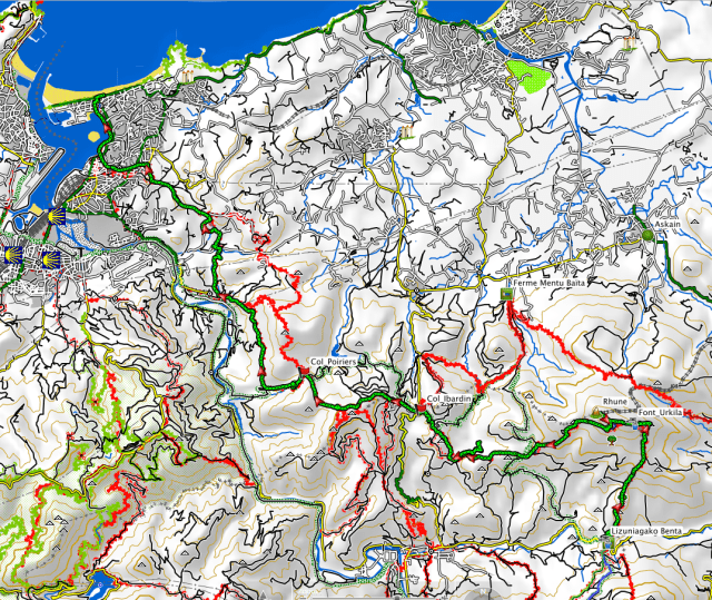 – Le verdict du GPS, Lizuniagoa-Hendaye : 4,2 k/h, 7h de marche, 9h10 de rando, 29,8 kms parcourus, 1246 m de dénivelé positif, plus haut : 893 m, plus bas : -3 m.
