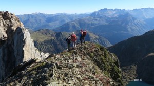 Descente, toujours en ligne de crête, vers le Ronglet. Lélé nous rappelle de bien prononcer le T final et ne pas dire Ronglé. On est bien en Béarn, Diu-Vivant (à prononcer « Dioubibane ») ! Main au rocher pour grimper une petite cheminée et le Ronglet (2180 m) est « dans la poche ».