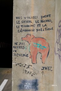 Le deuxième pensum attaque grave. De très nombreux véhicules montent soit vers les chantiers en montagne, soit vers les points de départ de randonnée. Il y en a beaucoup en vallée d’Ossau. Les diesels puant crachent leur venin. Damned, j’ai oublié le masque « technique » qu’arborent les pékinois !
