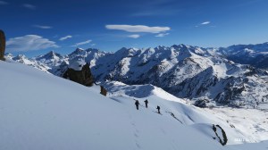 Premier échauffement jusqu’au col de l’Iou. Le soleil n’est pas encore là. La neige crisse sous les « planches ». La croûte glacée appelle les couteaux. Au col (2193m), facilement atteint, André nous rappelle que chez lui le « réveil ne sonne que pour la montagne ». Il doit sonner régulièrement : en ce 24 janvier, il annonce déjà 20 sorties de ski de randonnée à son actif !