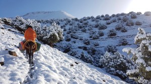 L’incroyable se produit durant la nuit. Il tombe 10 à 15 cm de neige. Un début mai ! Qui ose parler de réchauffement climatique ? Sachant que la neige ne tiendrait pas longtemps, je file prendre des photos alors que le gite est en sommeil. Montée vers les genévriers. Des bergers partent vers le lac d’Izourar pour s’occuper des bêtes. Surtout des agneaux qu’ils vont redescendre sur leurs ânes. Courts sur pattes, ils sont les premiers exposés aux risques de la neige. Le soleil brille. L’atmosphère est superbe.