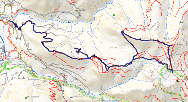 – Point le plus bas : 522m (pk arrivée à Béost), le plus haut : 1871 m (Soum de Grum), point de départ : 1074m. Dénivelé montant : 950m, descendant : 1350m, distance parcourue : 19km, durée de la sortie : 6h45