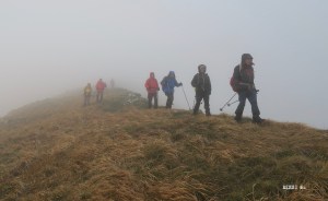 Devant, du brouillard émergent quelques randonneurs. Sous nous, aux cabanes de Niouères, d’autres randonneurs font pause. Des pingouins : tous d’un côté pour se protéger du vent. Rare de voir autant de monde en cette saison. Pour un peu, on se croirait à Bious Artigues !