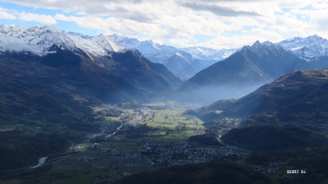 La crête atteinte, la vue au nord plonge sur Lourdes et Tarbes, juste derrière. Pau et la plaine de Nay au nord-ouest. Rien ne semble pourvoir perturber un paysage léché et tranquille. Piémont serein.