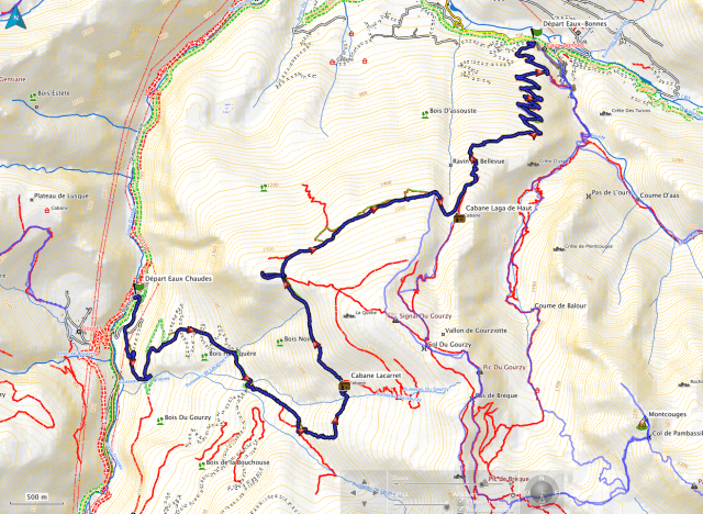 – Points le plus bas : parking du Casino à Eaux-Bonnes 720 et de La Caverne à Eaux-Chaudes 680, le plus haut : belvédère à 1557, sous les crêtes du Signal du Gourzy, entre les cabanes Lacarret et Laga de Haut, dénivelé : 1000 m, distance parcourue : 14 km, temps de la sortie : 6h30, carte 1547 OT