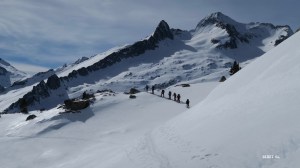 Grand silence dans la file indienne. Pas d’élastique. Il n’y en aura pas durant toute la longue montée (près de 10km). Olivier mène le train à un rythme qui n’abandonne personne. Seul le claquement des fixations rompt le silence.