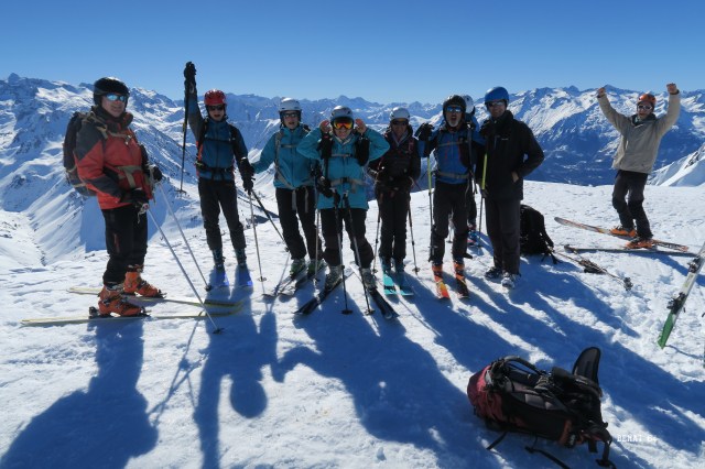 Un col atteint, baptisé col du Turon de La Lahude pour l’occasion, et c’est la direction NNO qui sera la notre jusqu’au sommet. Longue série terminale en Z (38 virages) qui se rétrécissent, de plus en plus, au fur et à mesure que le sommet approche. Conversions amonts ou avals. Sous le sommet, du 35° et une neige qui peut être tôlée. Quelques dérapages plus ou moins contrôlés. Bel effort qui met à contribution les randonneurs en manque d’entrainement. Sommet « vaincu » et pause méritée. Il est 13h.