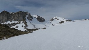 Malgré la neige, pas de difficulté particulière que ce soit pour grimper au Mailh Massibé ou en descendre vers le col de Losque. Jean-Pierre file comme un cabris dans la descente vers le col. Déjeuner sous le sommet du Montagnon de Bielle. Pas de soleil. Coupe-vent au bout d’un moment.