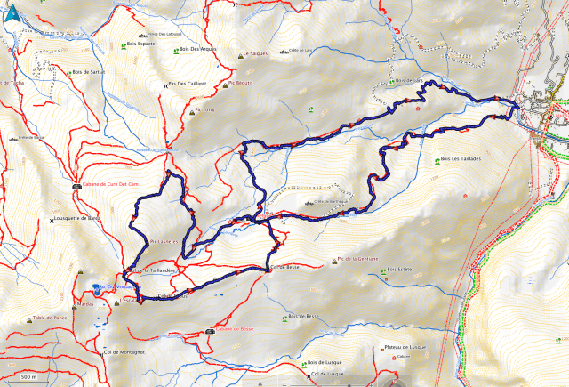 – Point le plus bas : parking du pont Barthèque 549, le plus haut : pic Lasnères 1998, dénivelé : 1700 m, distance : 19,1 km.