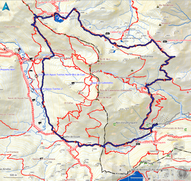 L’objectif initial était de monter au pic d’Aillary, à celui du lac d’Arlet et au pic d’Arlet en passant, à l’aller, par la magnifique plaine d’estive d’Aguas Tuertas et, au retour, par le col de la Contende. Sauf que : de fortes rafales de vent nous « accablent » au col d’Arlet et la progression sur les crêtes vers les 3 pics devient « hasardeuse ». La sortie se transforme alors, bien logiquement, en tour du pic d’Arlet, par le refuge et lac du même nom, le col de Lapachouau, la cabane Grosse et retour sur Espélunguère.