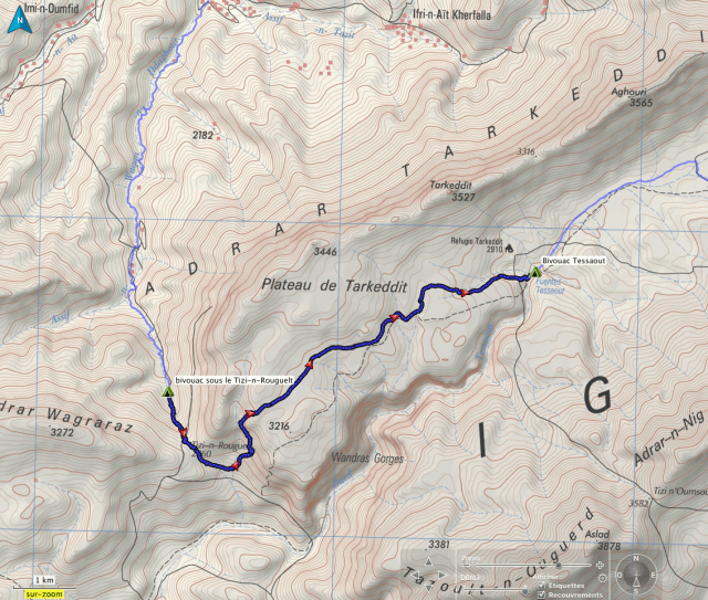 Depuis le bivouac, montée rapide au Tizi N’Rougoult (2860). Coussins de belle-mère en beauté. Au col, vues dégagées magnifiques. Descente de 180 m de dénivelé et attaque de pentes qui vont conduire à la courbe de niveau 3100 où nous cheminons, sous le plateau de Tarkeddit, un long moment : 5,5 kilomètres !