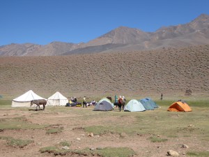 Reprise de la marche. Arrivée au campement situé sous le refuge (2910), à coté des sources. Luxueux : douches chaudes à ces altitudes.