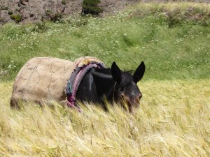 Les muletiers, partis devant, posent, à l’ombre sous une falaise, une natte pour notre déjeuner. A notre arrivée, le soleil a tourné et mord déjà la natte. Le repas se termine camouflé dans des anfractuosités de rochers qui passent, à leur tour, au soleil. Ne reste plus qu’à reprendre le cheminement. Il fait chaud.