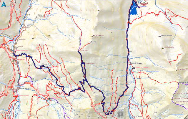 Descente groupée pour tous, en passant par le Petit Piméné (2520). Au col, le groupe 1 plonge vers l’ouest et Gavarnie. Le groupe 2 continue sur la crête sud puis bascule sur les pentes SE afin d’éviter de passer par la Hourquette d’Alans. Une sente bien cairnée apparait et permet de rejoindre facilement le sentier qui relie Estaubé à la Hourquette. Bonne pioche ! La manip économise 170 mètres de dénivelé montant. La sortie prévue à 1700 m de dénivelé tombe à 1530 !