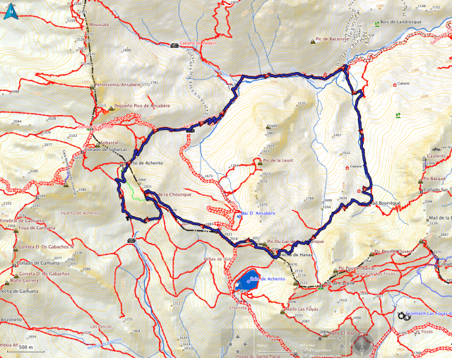 Chemin faisant : pont de Lamary au-dessus de Lescun (départ/arrivée 1180), vallon du Lazerque, pic Pourtet-Ouvert, brèche de Hanas 1995, lac d’Acherito, pic du Lac de la Chourique 2082, pic de la Chourique, mallo de Atcherito, pic de Pétragème (Sobarcal en esp.), col de la Chourique 1910 (puerto de Atcherito en esp.), cabane d’Ansabère, vallon d’Ansabère, pont Lamary