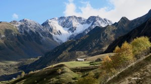 Le cirque de Gavarnie se camoufle dans une « crasse » tourbillonnante qui dévale les pentes depuis l’Espagne. Au Bergons : rafales fraiches et constantes. Replis sur la cabane de Bachebirou pour la pause casse-croûte. Il n’est que 10h40 !!! Le froid a réveillé l’appétit ! Un peu moins de vent coté est de la cabane.
