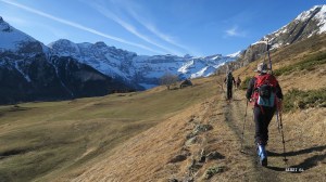 9h40 : les skis sont sur le sac. De 8 à 9 kg, ils sont passés à 11 ou 12. Les sacs, pas les skis ! Nouvelles très belles vues sur le cirque. Grand beau. Pas de vent. Portage facilité par la sente douce. Neige trouvée au bout de 1km et 135m de dénivelé. Bien. Progression facile tantôt en Z, tantôt en traversée montante. Neige facile, réchauffée par le soleil.