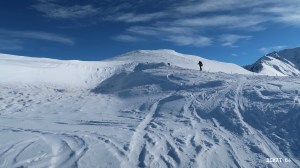 Pour le reste, une montée dans la forêt un peu poussive par manque de couche de neige en bas. Ensuite, sans difficulté, dans une trace en poudreuse d’une quinzaine de centimètres, un rail plutôt, sans discontinuer jusqu’au sommet. Sommet atteint sans passer par la Hourquette laissée à l’ouest. Plus court, un peu plus pente mais sans difficulté. Série de Z pour rejoindre la crête finale.