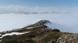 Remontée légère pour atteindre la crête de Coos. Début de descente prometteur jusqu’au Tousseau. Recherche du « couloir rigolo » sur notre droite. Pas visible, la nappe de brouillard flotte imperturbablement 100 mètres sous nous. D’autres appellent cela une « mer de nuages ». C’est poétique. C’est beau depuis un avion mais pas quand on doit y pénétrer, l’appréciation devient autre !