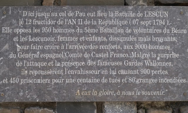 A Lescun, il faut savoir lire la plaque, posée place municipale, sur l’étonnante « Bataille de Lescun » où les contre-révolutionnaires royalistes, arrivant depuis l’Espagne le 7 septembre 1794, furent battus à plat de couture par les locaux épaulés du 5è « bataillon de volontaires du Béarn ». Près de 900 morts et 450 prisonniers pour les soutiens des « Bourbons ». Pour en savoir plus, la petite épicerie du village propose des livres rapportant ce fait historique.