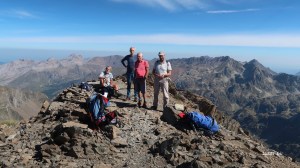 Remontée des pentes finales du Lurien dans une caillasse sans fin. Mains au rocher, de temps à autre, dans des cheminées faciles et arrivée au sommet (2826) à 11h30. Pause en compagnie d’une jeune Saint-Gironnaise. Sportive, en vacances, elle écume seule tout les grands de ce petit monde. Aujourd’hui, c’est le Lurien. Dès demain, elle sera dans le Couserans pour grimper, chez elle, un autre « 2800 » (au Couserans, les sommets n’atteignent pas les 3000). Un art de vivre : grimper les 2800 et plus… Ossau, Palas et Arriel sont sur sa « to-do-list » locale.