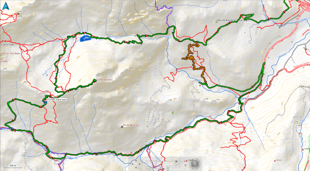 Retour sur le col « 1974 » et descente facile vers le refuge de Lhurs et son saloir. Le lac (1710) est en « étiage » bas. Un pêcheur nous dira qu’il lui manque au moins 3 mètres d’eau. Depuis le lac, belles vues vers les Trois Rois. Y revenir quand il sera en glace. Promesse de belles photos à y faire. Descente vers le parking d’Anapia. L’analyse de la carte numérique « Topo Pirineos 8.0 » montrait, à partir de la côte 1340, deux chemins forestiers descendant SE en direction du parking de Masousa. Arrivé à 1340, sur notre droite, vers l’aval, il n’y a que forêt et broussailles.