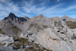 Arrivée au col. Les rafales décoiffent. Sortie des coupes-vents et gants. Prémisses d’hiver. Déjà ? Dommage… Montée sans difficulté au sommet du Dec de Lhurs. Un peu de main au rocher (calcaire et coupant). Beaux cairns aux sommets. Lequel est le bon ? Quatre « pyramides » prétendent au titre de Duc de L’Ours !