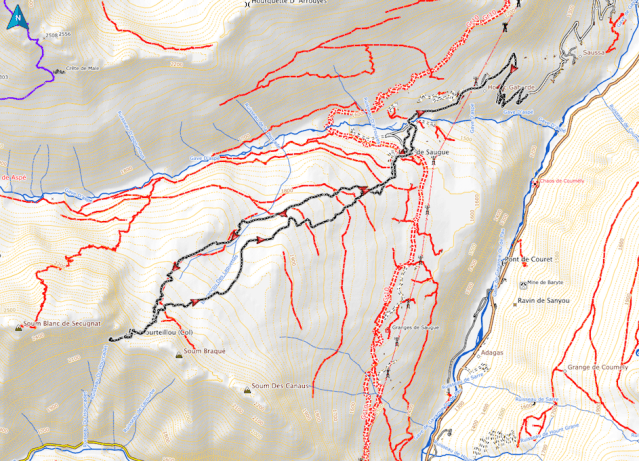 Descente en longeant le Barrancou de Laquettes par sa droite. S toujours. Déjà les granges de Saugué apparaissent. Trop vite, trop tôt. Pourquoi donc les bonnes choses doivent-elles toujours avoir une fin ? Pont sur le gave d’Aspé suivi des 2,5 km sur la route enneigée. Place aux marinettes et descente à la Brasserie du Pays Toy, à Luz, pour une bière bien méritée.