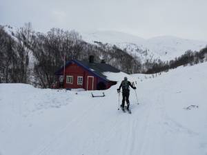 Pour les quatre autres, dont les spatules frétillaient depuis le petit déjeuner malgré la fine pluie visible par la fenêtre, la libération intervient vers dix heures ; un objectif modeste est choisi compte-tenu du temps (la météo) et du temps (l’heure tardive) : Pente Sud de l’imprononçable Kvalvikfjellet. Il fait doux, deux ou trois degrés une limite pluie-neige, faibles, annoncée à 500m.