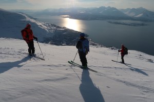 Une antécime est atteinte. Quand on croit que cela termine, il y en a toujours encore. Xavier annonce un petit reste à faire : 600 m et 75 m de dénivelé. Aussitôt avalés et le Stáluvárri est atteint (1252 m). Pause face à un univers de montagnes aiguisées qui plonge dans le fjord. Le tout dans une lumière pâle et un doux soleil tamisé. L’Intello est parti dans une contemplation sans fin. Le mot magique n’est pas assez fort. Serait-ce tout simplement le Paradis ?