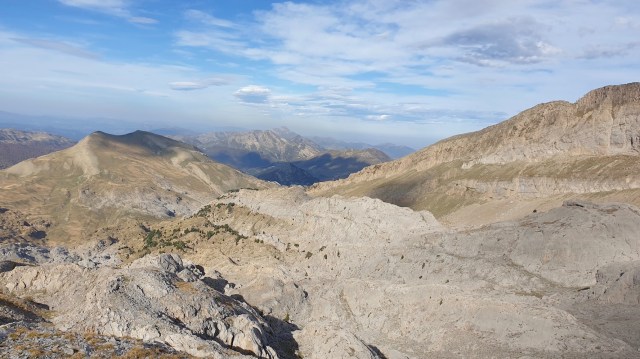 Démarre alors le parcours, en crête, qui conduit au Mouscaté. Belles vues sur le pic d’Ansabère et son aiguille. Continuation sur un terrain calcaire lardé de failles profondes. Réplique des, pas très lointaines, arres d’Anie. Surtout ne pas y être par temps de brouillard sinon c’est foutu !