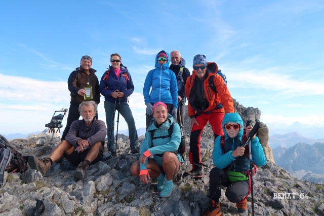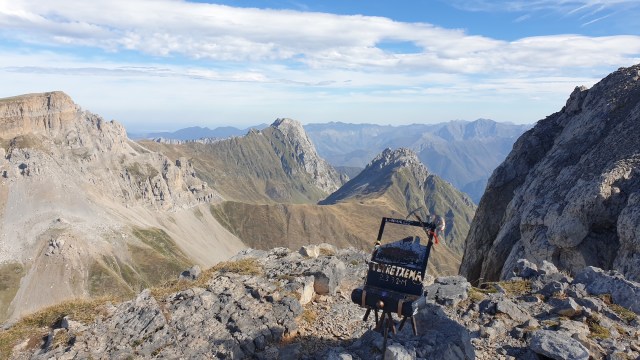 Etape suivante : un labyrinthe à parcourir pour aller chercher la sente qui file, en descendant, au bas de la crête ouest de Petretxema, nom d’origine basque, donnée au pic d’Ansabère. Remontée facile de la longue crête qui conduit au sommet. Facile, douce même, sauf que le vent en a décidé autrement. Agressif, au sommet, il décoiffe carrément : pause photo rapide, pause casse-croûte impossible. Dommage. Le temps de la contemplation s’éloigne…