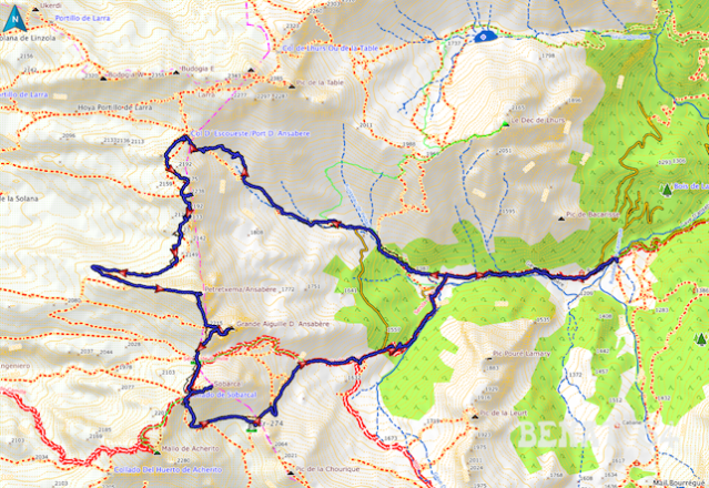 Retour sur vécu : si la montée au Sobarcal complète bien la boucle des crêtes d’Ansabère, il est certainement plus facile de redescendre sur la cabane par le port d’Ansó/col de Petragème et c’est probablement plus court. A méditer pour la prochaine édition de la boucle.
