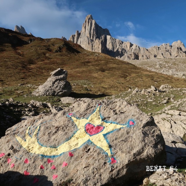 Montée par le vallon de Pedain. La cabane et son environnement sont nickels. Des bergères la tiennent ! Mountain Art sur rocher. Sympa Mesdames.