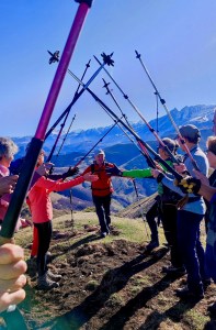 Arrivés au pic de Coos, depuis les crêtes éponymes, « Aste » organise une double haie d’honneur, bâtons levés au ciel, pour « Listo » qui remonte hardiment la crête entre le col d’Agnouresᵗ et le Coos. Les premiers se rapprochent. Aste scande, avec vigueur, le « compte à rebours » pour encourager les grimpeurs : 5, 4, 3, 2, 1… suivi d’un « Bonne Année » sonore. L’exercice se répète 14 fois jusqu’à ce que les derniers arrivants de Listo rejoignent le tunnel de la haïe d’honneur. L’ambiance est donnée. Sourire généralisé. Fatigue évanouie. Convivialité totale. La fête commence.