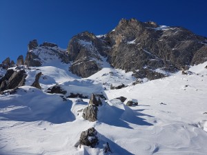 Il est là avec son entrelas de rochers de toutes tailles, de toutes dispositions. Tous recouverts d’une belle couche de neige fraîche et scintillante. Un univers casi-polaire à parcourir. Exposé nord, les pentes les plus fortes appellent la pose des couteaux. Neige tantôt taûlée, tantôt fraîche, tantôt frittée. Pour tous les gouts. A mi-parcours, tirer sur la gauche, pour ne pas se laisser entrainer dans un vallon sans issue.