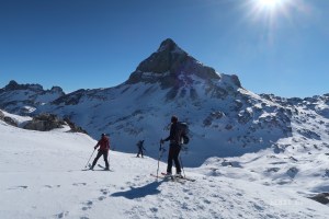 La vallée d’Ossau a son emblème, l’Ossau. La vallée d’Aspe a le sien l’Anie, Auñamendi pour les espagnols. L’un et l’autre ont du caractère. Si l’un rappelle la tête d’une truite émergeant des tréfonds de la terre, l’autre serait une fantastique pyramide dominant des « arresᵗ d’Anie » quasi-inaccessibles. Le pic parait imprenable et, en cette très belle journée, peu d’y aventureront. Il faut dire son approche est compliquée par un chaos de schistes calcaires, creusés de gouffres multiples, de dolines improbables et de falaises saillantes. Les « arres d’Anie », les parcourir à ski de randonnée, c’est d’abord du ski aventure. A l’aller, un cap à suivre apparait de temps à autre : l’Anie que l’on voit chaque fois que la collective émerge d’une dépression. Au retour, l’Anie est derrière. Devant rien, si ce n’est l’interminable chaos à traverser. Une sortie ski différente qui demande patience pour la terminer.