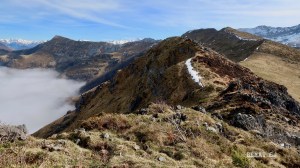 Arrivée au sommet et vue sur la plaine. Sous nous Pédéhouratᵗ. Au loin, au nord, Pau la blanche. Repli un peu en contrebas car un petit vent froid souffle sur la crête.