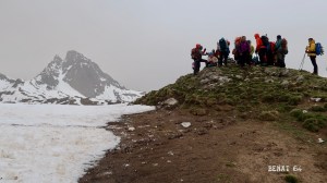 11h30, arrivée au col et appel de Juan-Miguel, depuis la vallée. Il vient de recevoir « una llamada telefonica » (appel) d’Alberto se demandant où nous étions. L’équipe espagnole est déjà au sommet et nous, sous eux, au col ! Mauvais timing. Là haut le vent du sud se déchaine et les troupes ne souhaitent qu’une chose : redescendre. Les « maños » sont condamnés à nous attendre…