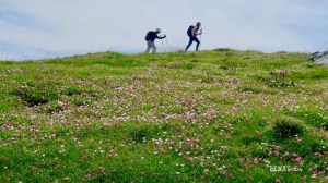 La boucle, des sommets Permayouᵗ (ᵗ= toponymie – voir au bas du compte-rendu) et Ronglet, a été décrite lors d’un précédent compte-rendu de 2022 : ICI. Inutile donc de revenir là-dessus. Cette année, la collective s’intitule, plus précisément, « le jardin du Permayou en boucle ». Et jardin, il y a ! Un dense tapis de fleurs différentes : un plein les yeux qui démarre, à partir du bas des pentes qui conduisent au Permayou pour aller jusqu’au sommet et continuer ensuite vers le Ronglet, sa brève « ascension » et la descente, par le vallon du Ronglet jusqu’à la forêt qui domine la cabane Lapassaᵗ. L’apothéose se situe sous le Permayou lui-même avec un épais tapis multicolore incomparable. Un tapis d’Orient digne des palais des milles et une nuits que nous hésitons à piétiner.
