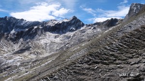 Partis en direction ESE, devons trouver une pierre, plantée verticalement par les bergers, où nous prendrons la direction SO pour rejoindre le bas du Clot des Margalidesᵗ. Cap vers les formidables pentes calcaires de la crête de la Latte de Bazen. Le Clot, replat d’altitude à 2000, les longe sur 7 à 800 m avant d’avoir à s’élever, au fond du Clot, pour chercher une direction plein sud qui laisse sur la droite la brèche Esquerra, puis le pic Esquerra, pour rejoindre la passe de Bourroux. Un peu de neige depuis le fond du Clot. Juste un saupoudrage précurseur qui disparait, sous nos pieds, une fois franchie la passe orientée Sud.