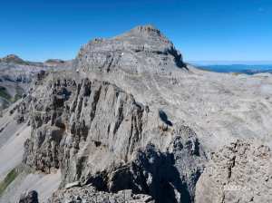 Le Countendéᵗ (ᵗ= toponymie – voir au bas de la chronique) n’est pas le plus connu des nombreux sommets du secteur Anie mais il offre un final ludique inégalable. Cheminer le long de sa paroi rocheuse, faire un petit pas d’escalade pour rejoindre les abords d’un gendarme pour les uns, Capéran pour les autres, le contourner, franchir un petit ressaut exposé, remonter le long d’un couloir à la pierraille fuyante. Epargner les suivants d’une chute de pierre. Bref, un exercice millimétré où tout le monde reste concentré. 11h30 : sommet atteint. Contemplation à 360°. Photo de groupe. Trop tôt pour casse-croûter. Eviter aussi de redescendre engourdis et sur la sommeillante digestion. Décidons de rejoindre le pas du Countendé à demi-heure de là.